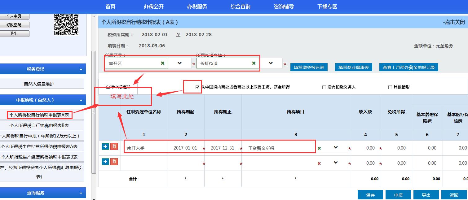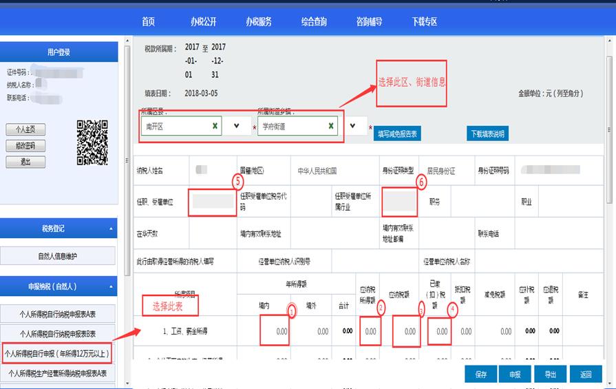 完成自然人注册后,即可输入相关信息,登录个人界面并进行纳税申报。根据需自行申报情形不同,纳税人应选择对应表格进行填报。