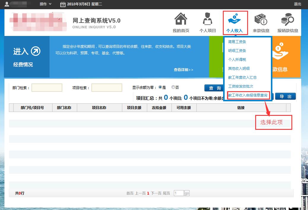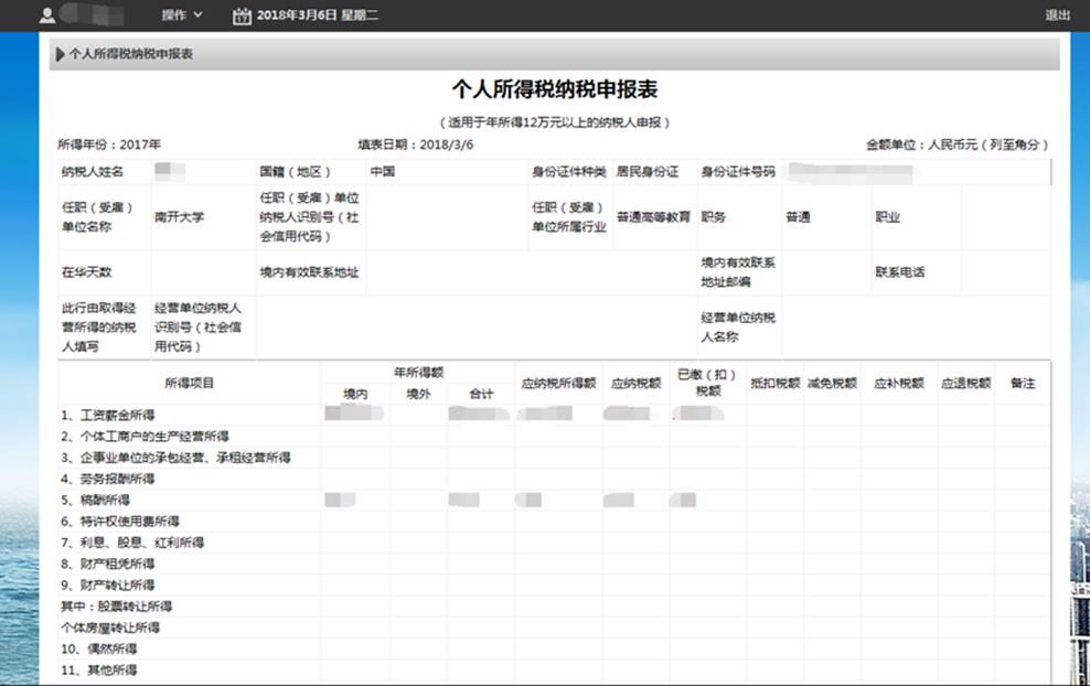 工资薪金所得年所得额超过12万的纳税人均需自行进行纳税申报。符合12万以上纳税申报条件的纳税人可登录学校财务处网站(cwc.nankai.edu.cn),选择“财务信息平台”—“财务查询系统”—“个人收入”—“教工年收入申报信息查询”,打开个人所得税纳税申报表。因部分纳税人在校外存在劳务报酬等特殊情况的存在,此申报表中数据仅供参考,具体请以各纳税人实际收入情况为准。具体操作可参照下方图示。