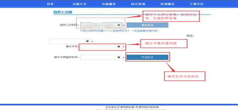在此界面,选择“个人登录”,点击“自然人注册”。自然人注册需要纳税人填写自然人识别号(证件号码)、真实姓名、银行卡号、银行卡预留手机号等信息。如下图中所示: