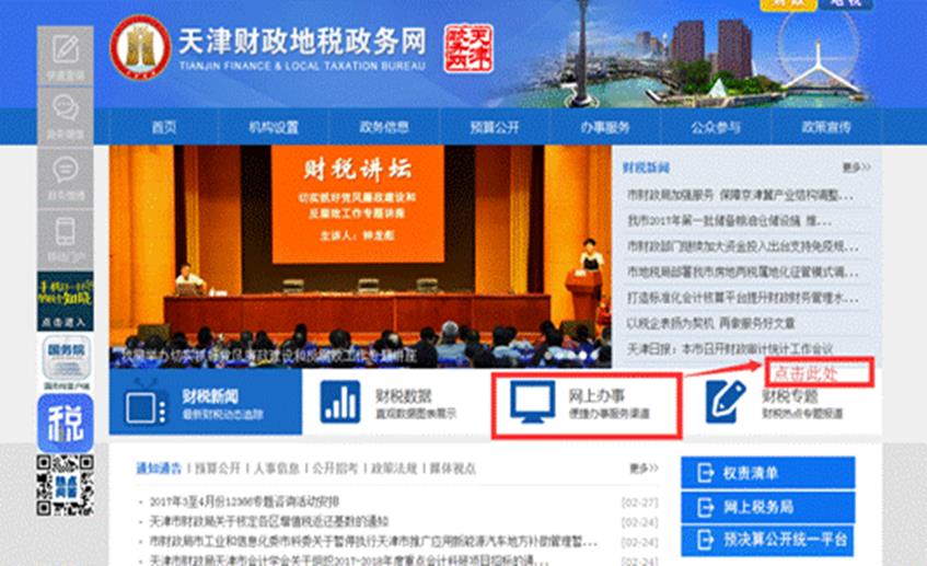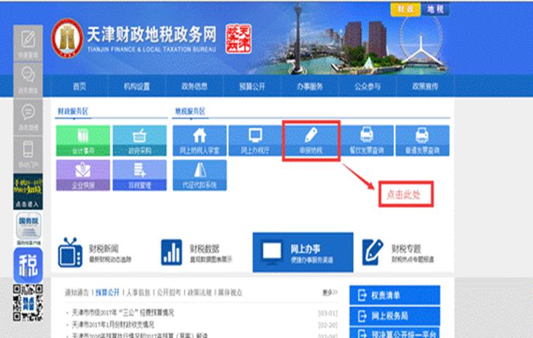 持有和本市手机号码绑定的银联卡的纳税人,可先在天津市财政地税政务网(http://www.tjcs.gov.cn)进行自然人注册,然后联网进行纳税申报,如需补缴税款,可一并补缴税款。具体注册流程为:打开天津市财政地税政务网,选择“网上办事”—“申报纳税”,进入天津市地方税务局网上办税服务厅首页。如下图所示: