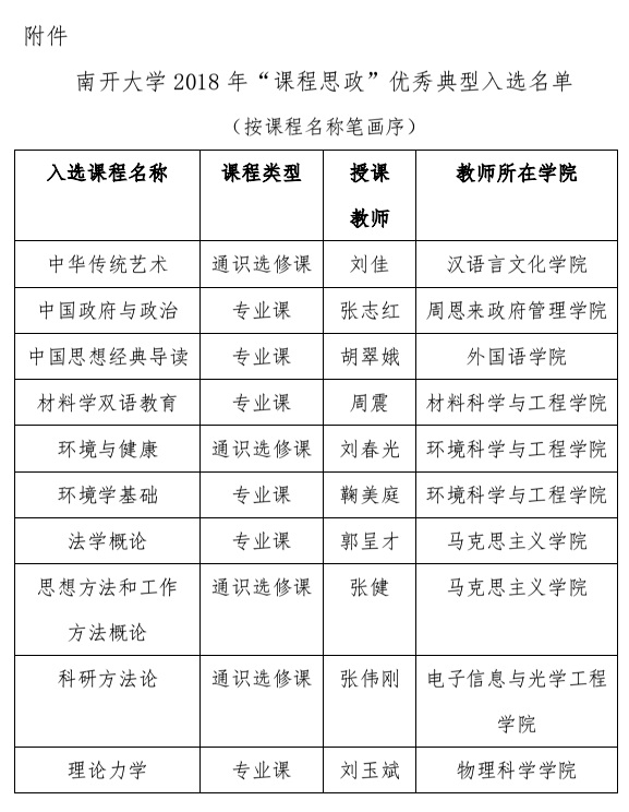 根据《关于开展南开大学2018年“课程思政”发现活动的通知》(教通字[2018]38号)要求,经学院推荐、专家组评审、校本科教学指导委员会评定,确定“中华传统艺术”等十门课程入选2018年“课程思政”优秀典型名单。