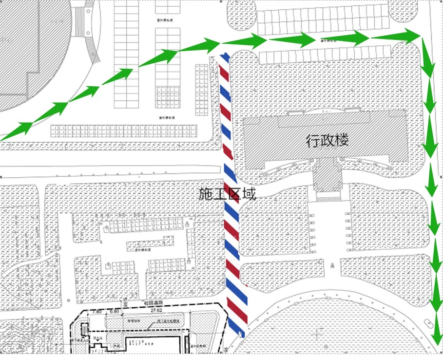 由于行政楼西侧道路施工,此路段即日起至2019年8月11日临时断交。请过往车辆绕行,注意安全,给您带来不便,请谅解。(断交路段及绕行路线详见下图)