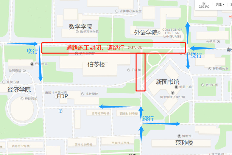 因八里台校区伯苓楼消防配套改造工程需要,8月15日至8月21日,封闭乐群北路图书馆至经济学院路段。请过往车辆及行人及时绕行,注意安全。