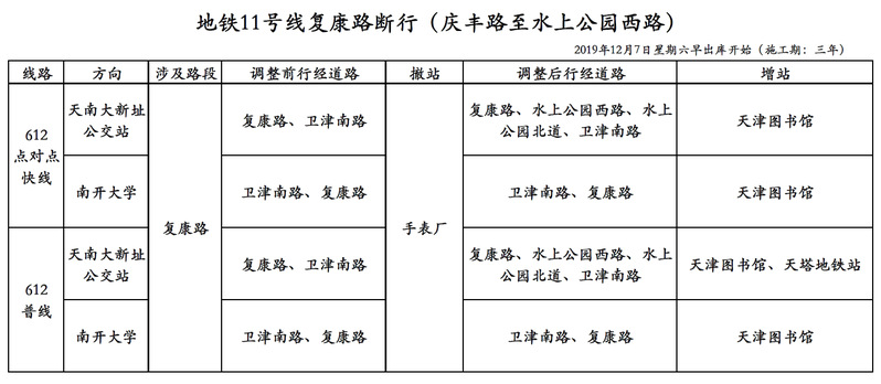 因复康路地铁施工,自2019年12月7日起,612行车线路将有所调整,为期三年,具体安排如下: